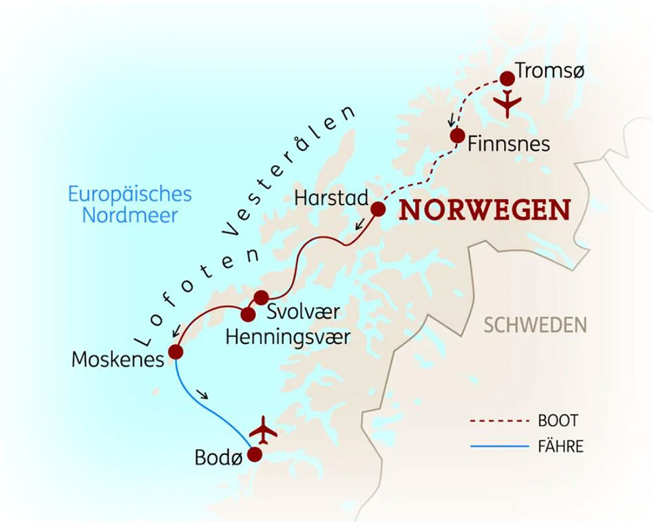 - Flug (Economy) mit Lufthansa von Frankfurt/M. (FRA) nach Tromsø (TOS) und zurück von Bodø (BOO), nach Verfügbarkeit. Weitere Abflughäfen auf Anfrage.