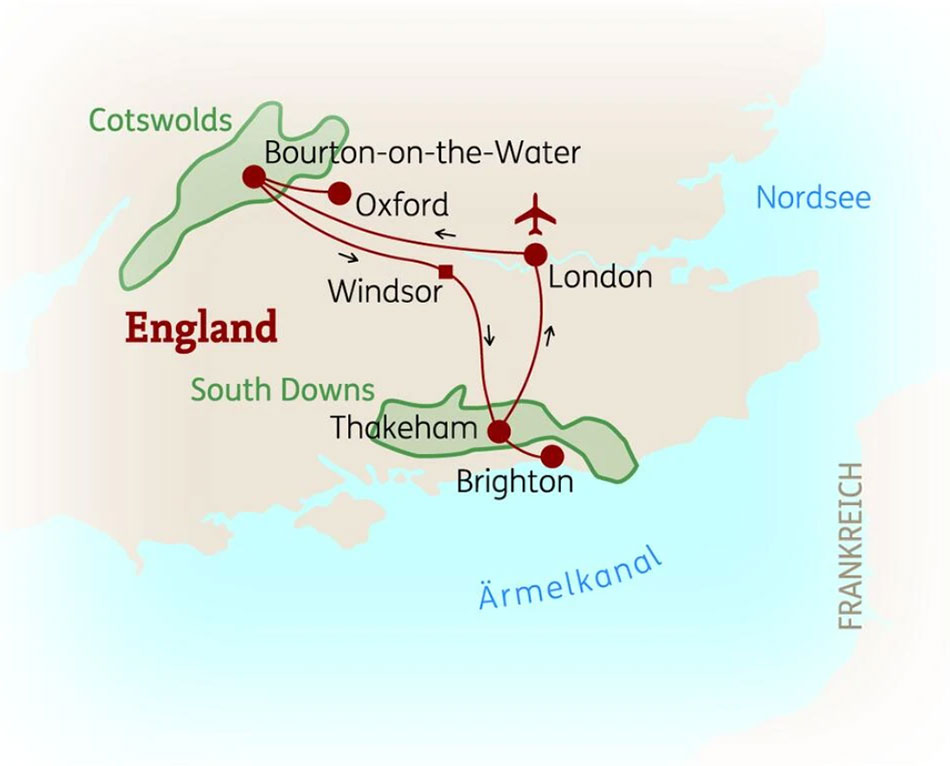 Nach Ankunft am Flughafen London Heathrow werden Sie von Ihrer Reiseleitung in Empfang genommen. Zusammen mit Ihren Mitreisenden geht es in Richtung Nordwesten, direkt ins Herz von Englands: in die Cotswolds. Mit den sehr gepflegten, parkähnlichen Landschaften und den idyllisch gelegenen Häusern beeindruckt diese Gegend nicht nur Reisende, sondern ist auch ein Anziehungspunkt für die Briten. Schauen Sie unterwegs aus dem Fenster und genießen Sie die Aussicht auf die hügelige Umgebung. Nach Ihrer Ankunft in Bourton-on-the-Water beziehen Sie Ihr erstes Hotel. Stimmen Sie sich bei dem gemeinsamen Abendessen mit Ihrer Reisegruppe auf die kommenden Tage in Südengland ein. 3 Nächte im Raum Cotswolds. (A) (Fahrtstrecke: ca. 130 km; Fahrtzeit: ca. 1,5 Std.)